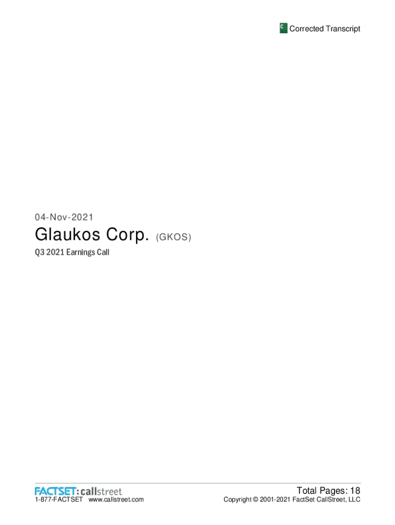Corrected Transcript04Nov2021Glaukos Corp.(GKOS)Q3 2021 Earnings CallTotal Pages: 18 1877FACTSET www.callstreet.comCopyright 20012021 FactSet CallStreet, LLCGlaukos Corp. (GKOS)Corrected TranscriptQ3