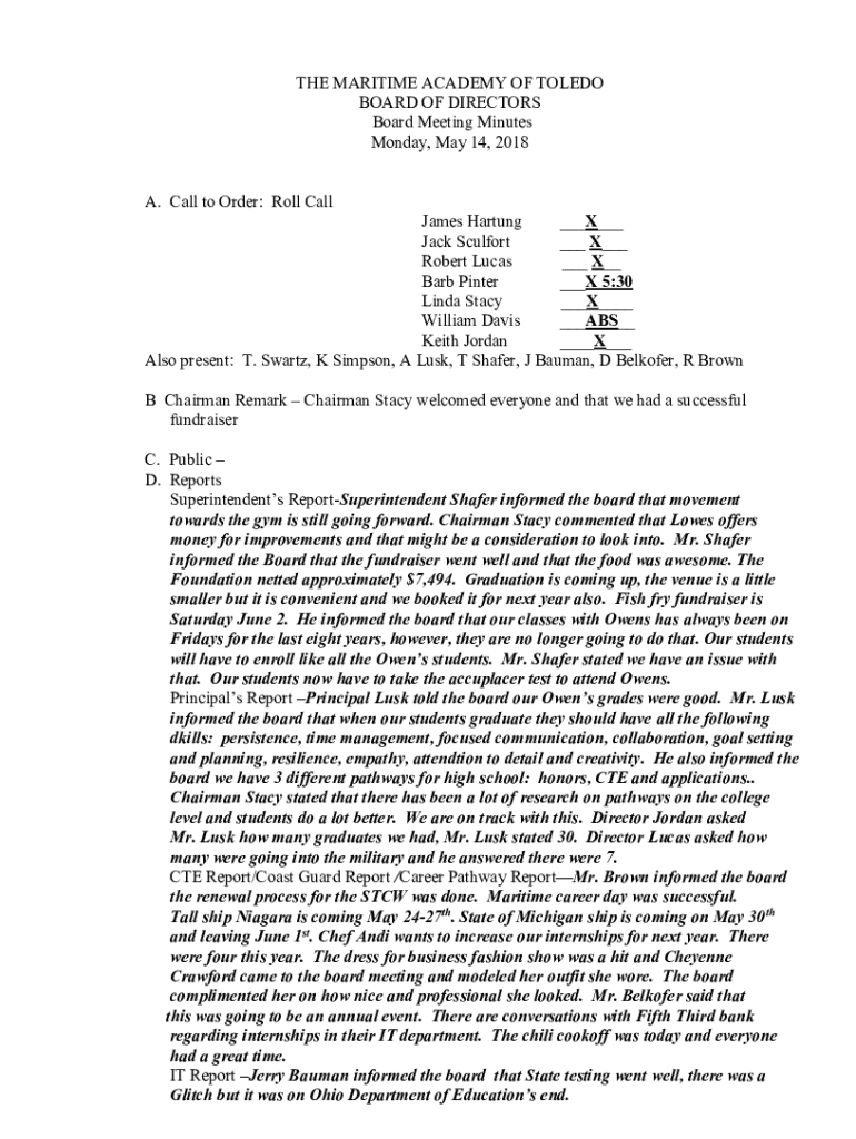 THE MARITIME ACADEMY OF TOLEDO BOARD OF DIRECTORS Board Meeting Minutes Monday, May 14, 2018A. Call to Order: Roll Call James Hartung ___X___ Jack Sculfort ___ X___ Robert Lucas ___ X__ Barb Pinter