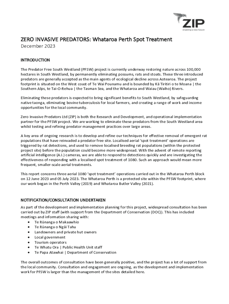 ZERO INVASIVE PREDATORS: Whataroa Perth Spot Treatment December 2023 INTRODUCTION The Predator Free South Westland (PFSW) project is currently underway restoring nature across 100,000 hectares in