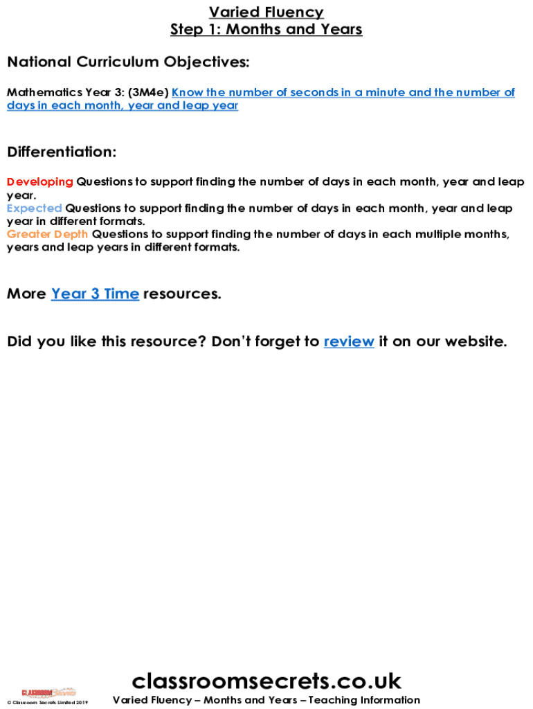 Varied Fluency Step 1: Months and Years National Curriculum Objectives: Mathematics Year 3: (3M4e) Know the number of seconds in a minute and the number of days in each month, year and leap yearDifferentiation: