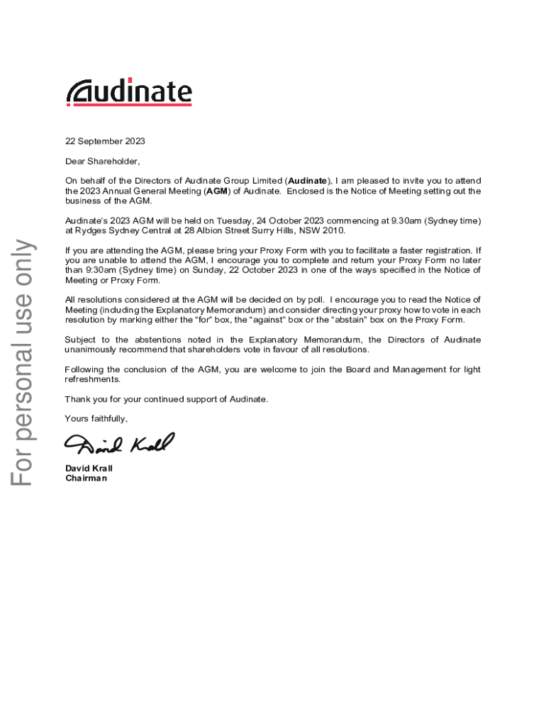 22 September 2023 Dear Shareholder, On behalf of the Directors of Audinate Group Limited (Audinate), I am pleased to invite you to attend the 2023 Annual General Meeting (AGM) of Audinate. Enclosed