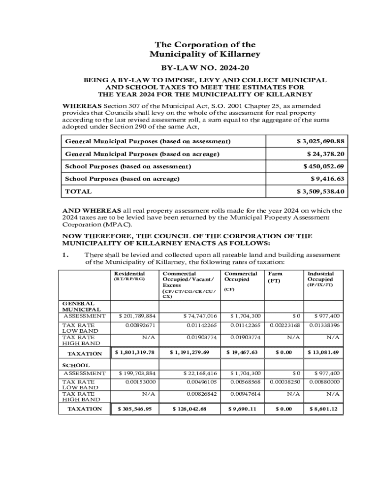 The Corporation of the Municipality of Killarney BYLAW NO. 202420 BEING A BYLAW TO IMPOSE, LEVY AND COLLECT MUNICIPAL AND SCHOOL TAXES TO MEET THE ESTIMATES FOR THE YEAR 2024 FOR THE MUNICIPALITY