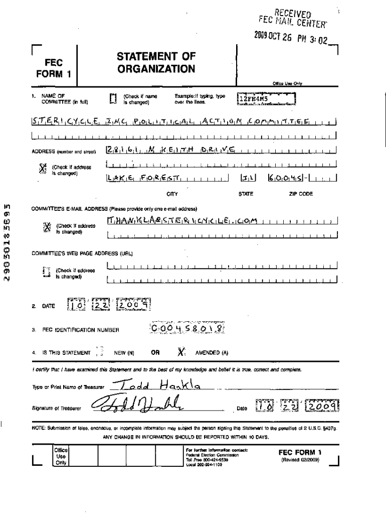 DECEIVEDNAIL CENTER\'20090CT26 PM3.02rlSTATEMENT OF ORGANIZATIONFEC FORM 1Office Use Only1.DNAME OF COMMITTEE (ir(Check if name is changed)Example: If typing, type over the lines.|l2FE4M5^_^^ ]iADDRESS