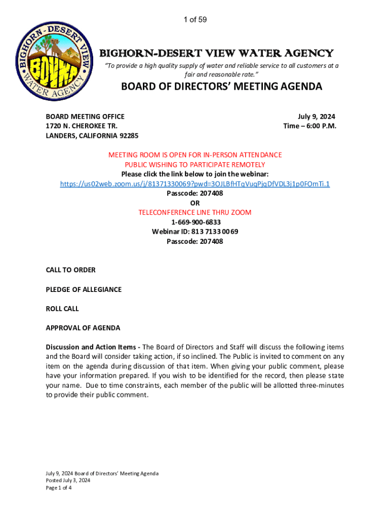 1 of 59BIGHORNDESERT VIEW WATER AGENCY To provide a high quality supply of water and reliable service to all customers at a fair and reasonable rate.BOARD OF DIRECTORS MEETING AGENDA BOARD MEETING