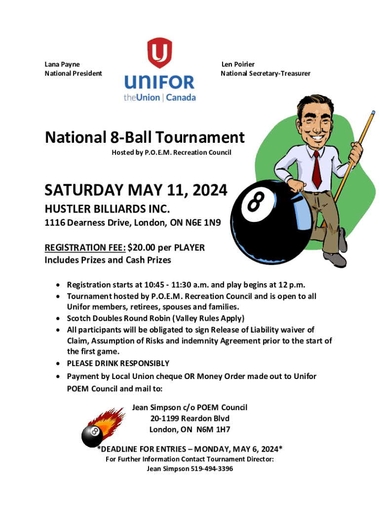 This document is a registration form for the National 8-Ball Tournament hosted by P.O.E.M. Recreation Council. The tournament is set to take place on May 11, 2024, at Hustler Billiards Inc. in London, Ontario. It outlines the registration details, the associated fees, safety waivers, and contact information. Participants must agree to a release of liability before competing.