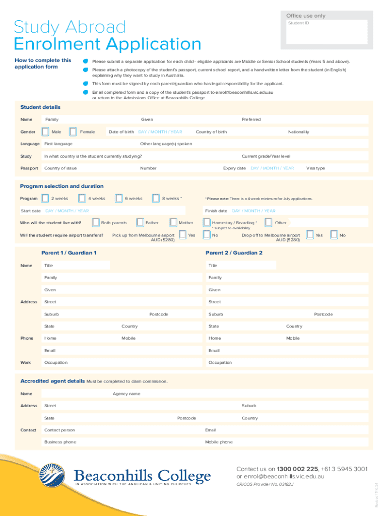Office use onlyStudy Abroad Enrolment Application How to complete this application formStudent IDPlease submit a separate application for each child eligible applicants are Middle or Senior School