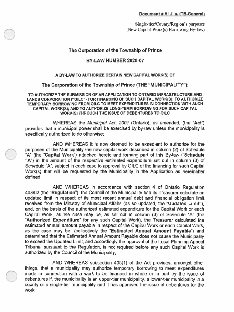 This document is a by-law passed by the Township of Prince to authorize certain new capital works, which includes temporary and long-term borrowing to finance the purchase of a new MaxiMetal Tanker Truck. It outlines the process for applying to the Ontario Infrastructure and Lands Corporation for financing and establishes the responsibilities of municipal officials in managing the debt and financing agreements.