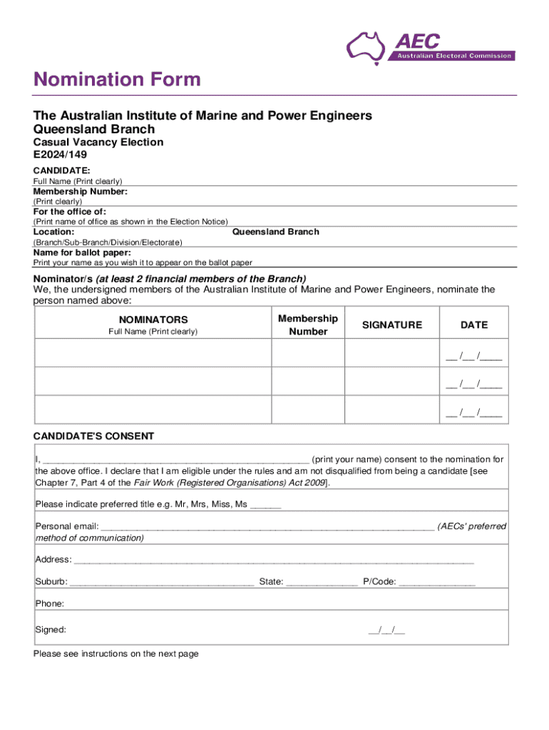 This document is a nomination form for candidates wishing to participate in the Casual Vacancy Election held by the Queensland Branch of the Australian Institute of Marine and Power Engineers. It includes sections for candidates to provide personal details, nominations from financial members, consent, and information about the election process, including deadlines for nominations and voting procedures.