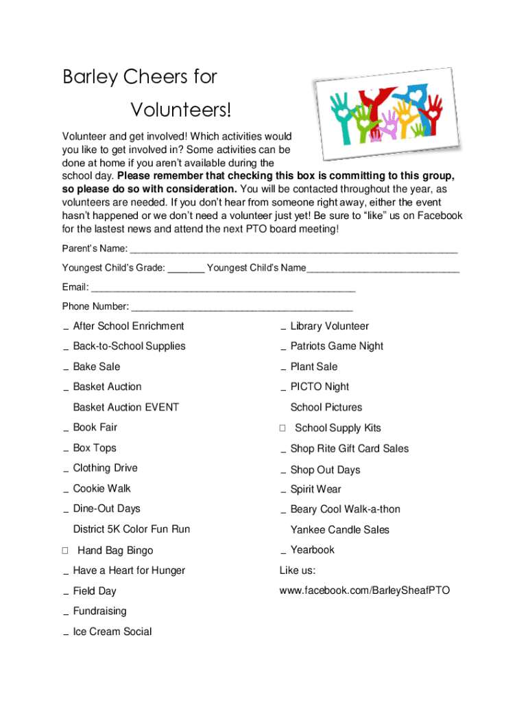 Barley Cheers for Volunteers! Volunteer and get involved! Which activities would you like to get involved in? Some activities can be done at home if you arent available during the school day. Please