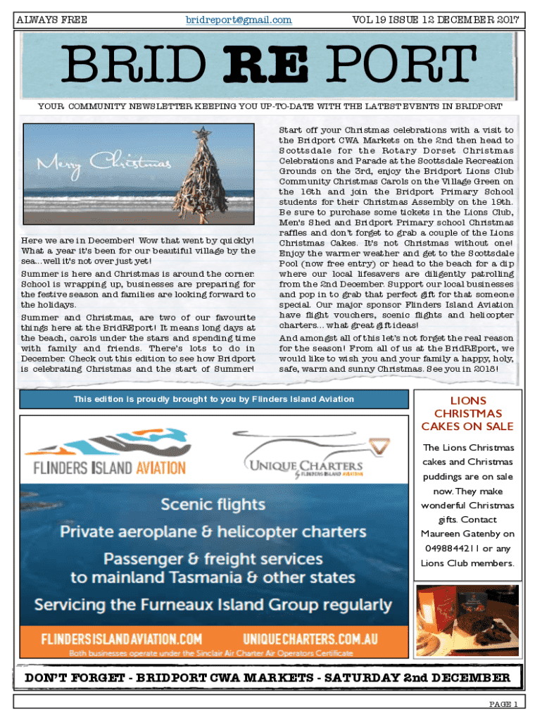 The December 2017 edition of the BridReport community newsletter, covering local events, Christmas celebrations, and seasonal activities in Bridport. The newsletter highlights community markets, school events, sports activities, and encourages local shopping and community involvement.