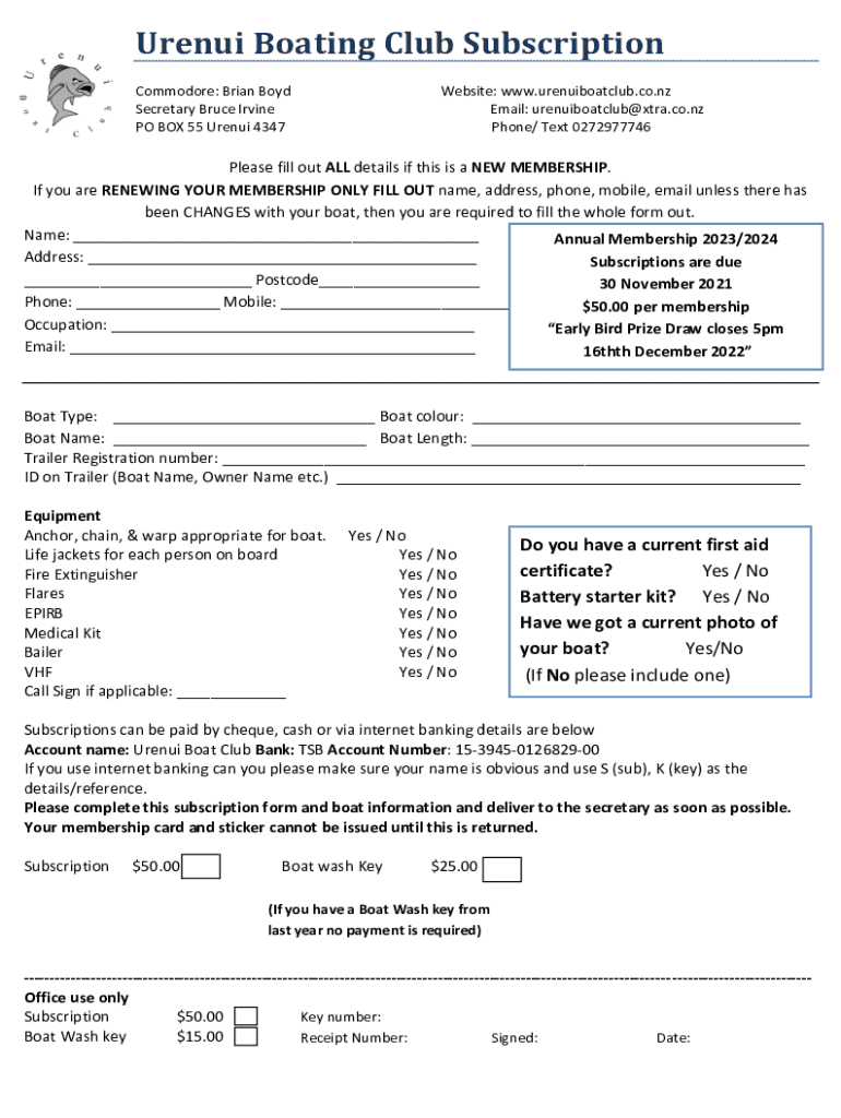 Urenui Boating Club Subscription Commodore: Brian Boyd Secretary Bruce Irvine PO BOX 55 Urenui 4347Website: www.urenuiboatclub.co.nz Email: urenuiboatclub@xtra.co.nz Phone/ Text 0272977746Please fill