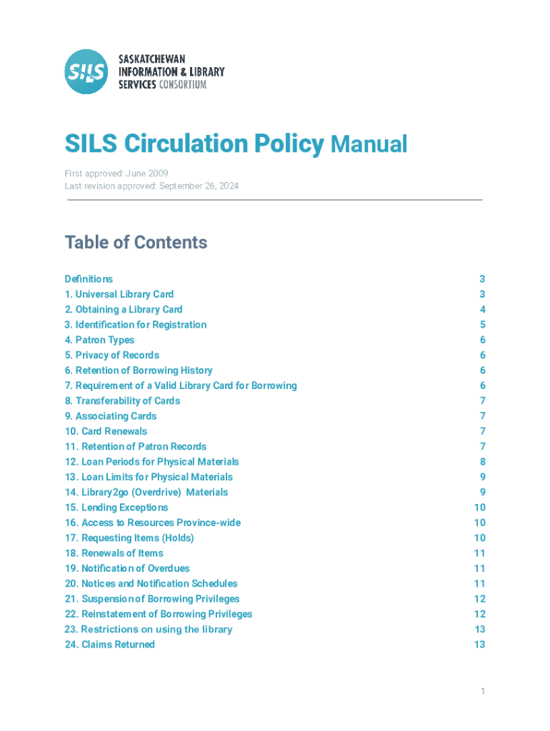 SILS Circulation Policy Manual First approved: June 2009 Last revision approved: September 26, 2024Table of Contents Definitions 1. Universal Library Card 2. Obtaining a Library Card 3. Identification