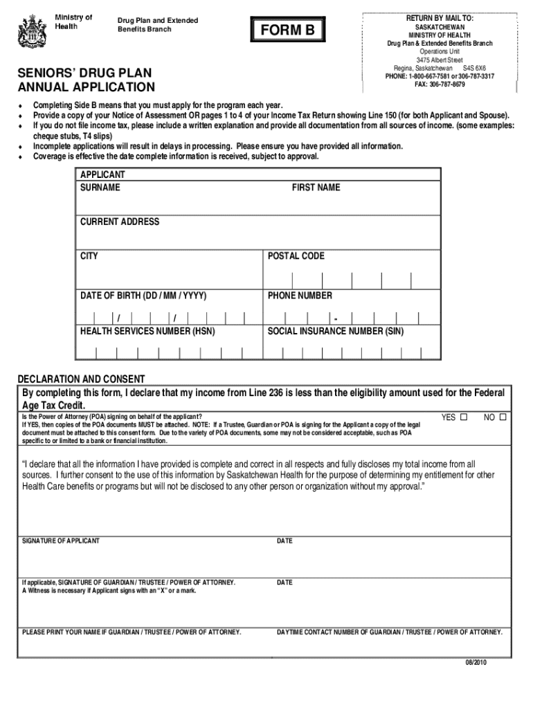 This document is an annual application form for the Seniors\' Drug Plan provided by the Saskatchewan Ministry of Health. It requires applicants to declare their income and provide necessary documentation to determine their eligibility for benefits. The form must be completed each year and submitted to the Drug Plan & Extended Benefits Branch, and it includes sections for personal information, consent, and declarations.