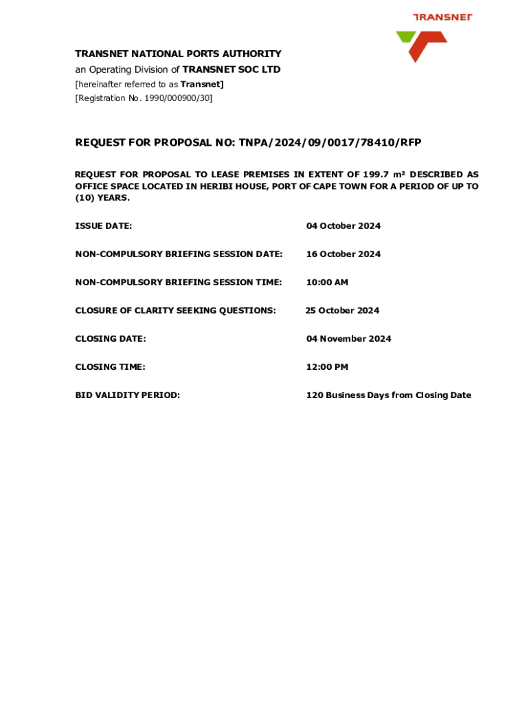 This document outlines the Request for Proposal (RFP) issued by Transnet National Ports Authority for leasing office space of 199.7 m² located in Heribi House, Port of Cape Town for a period of up to 10 years. It includes details regarding issue dates, proposal submission processes, requirements for bidders, and information on evaluation methodology.