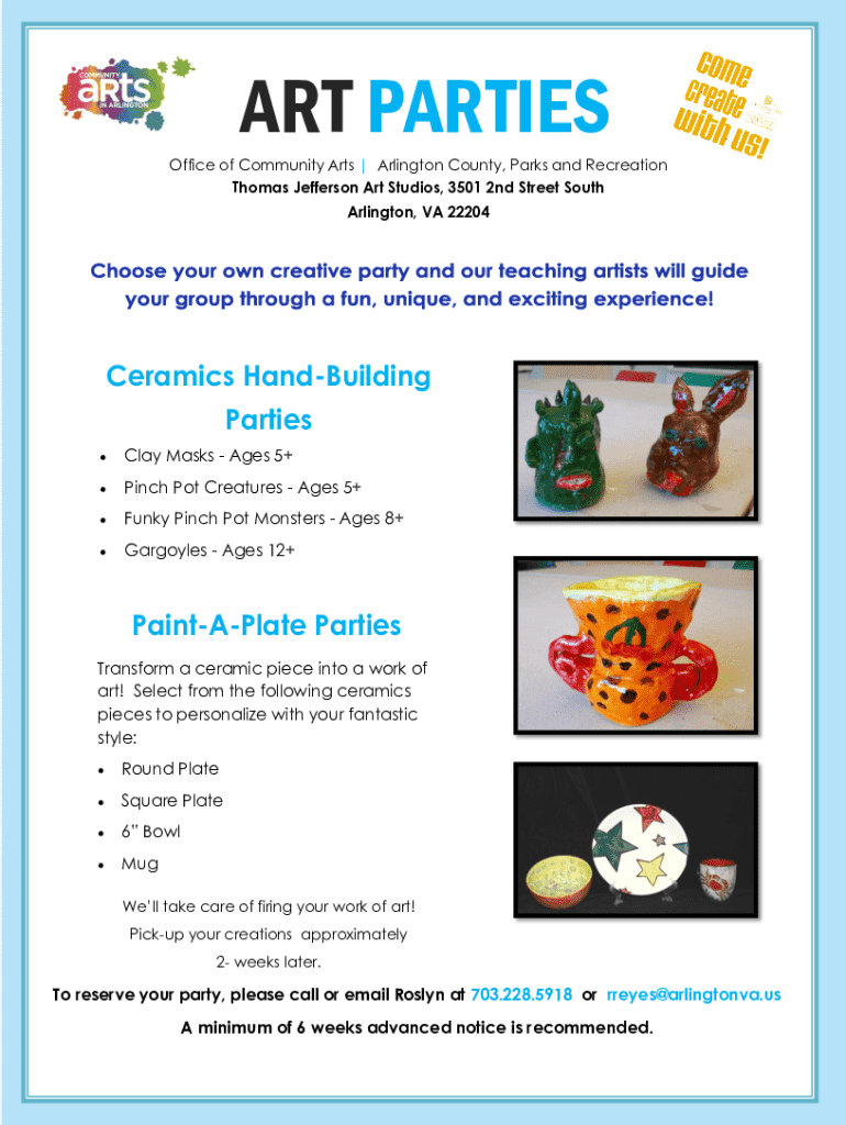 This document outlines the details and reservation process for art parties offered by Arlington County\'s Office of Community Arts, including options for ceramics hand-building and paint-a-plate parties. It provides information on pricing, age groups, scheduling, and necessary precautions including a hold harmless agreement.
