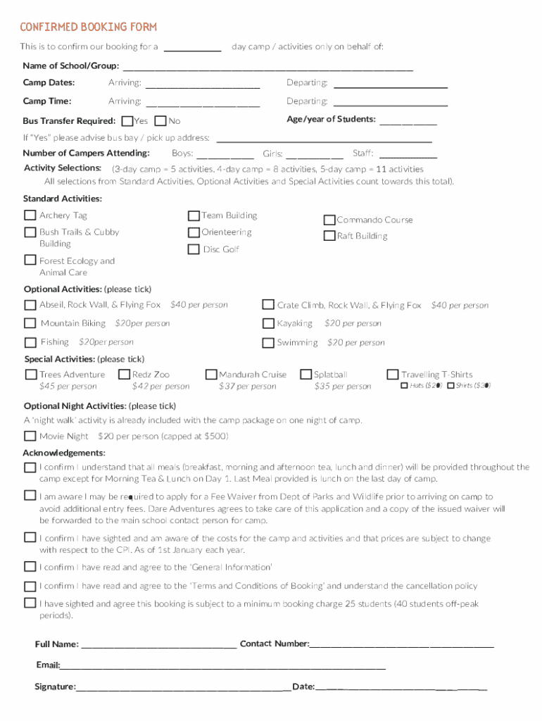 CONFIRMED BOOKING FORM day camp/ activities only on behalf of:This is to confirm our booking for a Name of School/Group:Camp Dates:Arriving: Departing:Camp Time:Arriving:Departing:Bus Transfer Required:D