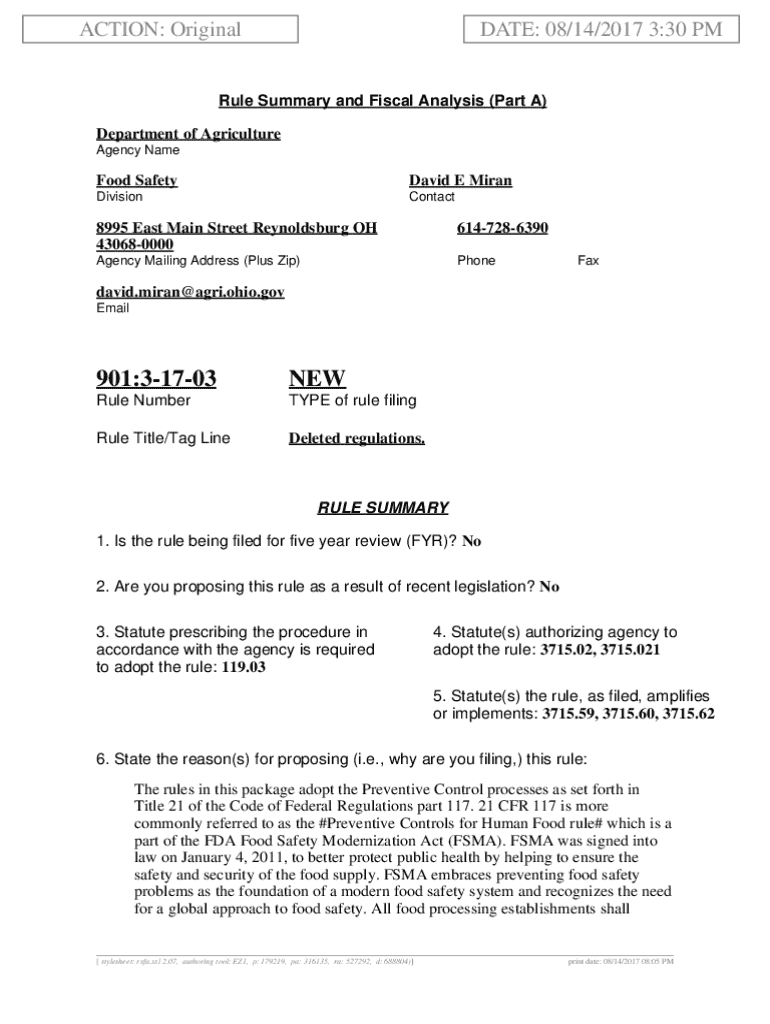This document outlines the proposed rule 901:3-17-03, which adopts regulations related to Preventive Control processes as mandated by the FDA Food Safety Modernization Act (FSMA). It details the compliance requirements for food processing establishments in Ohio to ensure the safety and security of the food supply. The rule mirrors federal regulations to facilitate nationwide shipping for Ohio\'s food manufacturers and identifies the deletion of certain enforcement procedures that apply only...