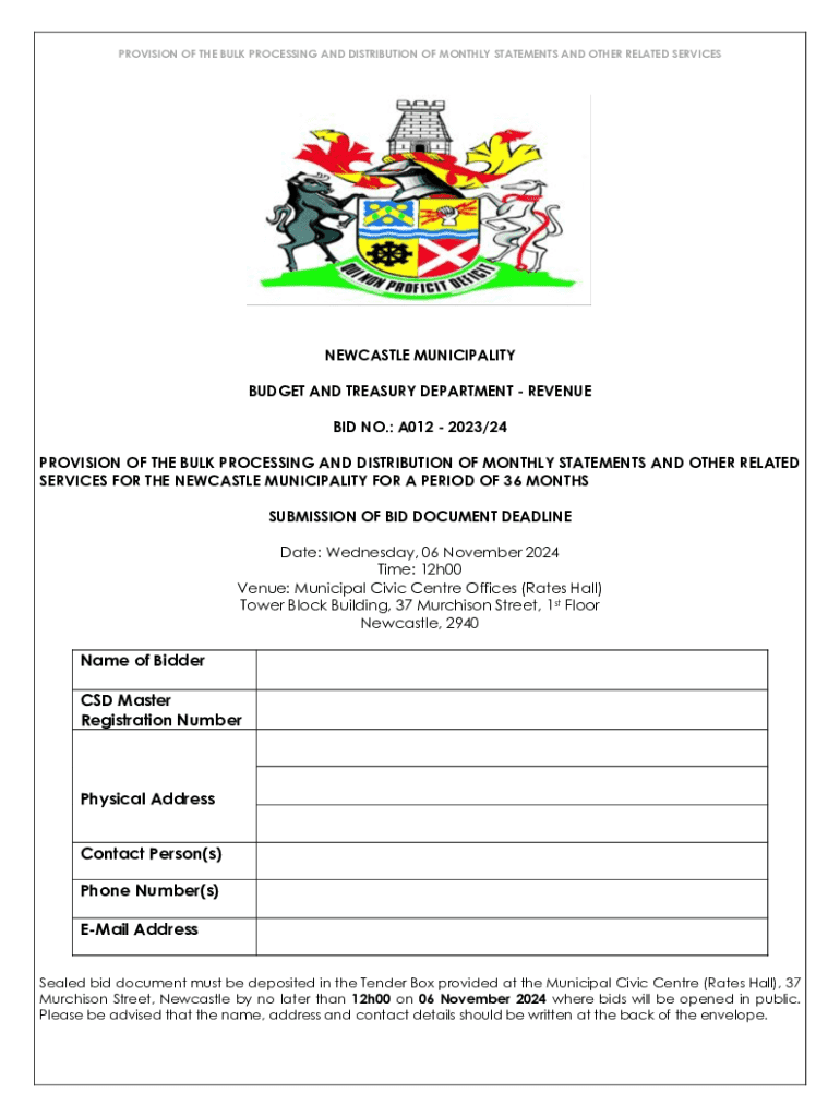 This document outlines the bidding process for the provision of bulk processing and distribution of monthly statements and other related services for the Newcastle Municipality for a duration of 36 months. It includes details on eligibility requirements, submission guidelines, technical specifications, and evaluation criteria for applicants.