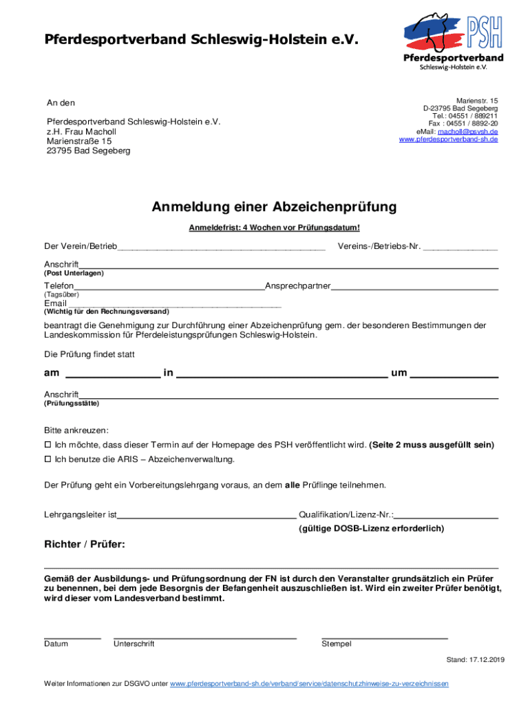 Pferdesportverband SchleswigHolstein e.V.Marienstr. 15 D23795 Bad Segeberg Tel.: 04551 / 889211 Fax : 04551 / 889220 eMail: macholl@psvsh.de www.pferdesportverbandsh.deAn den Pferdesportverband SchleswigHolstein