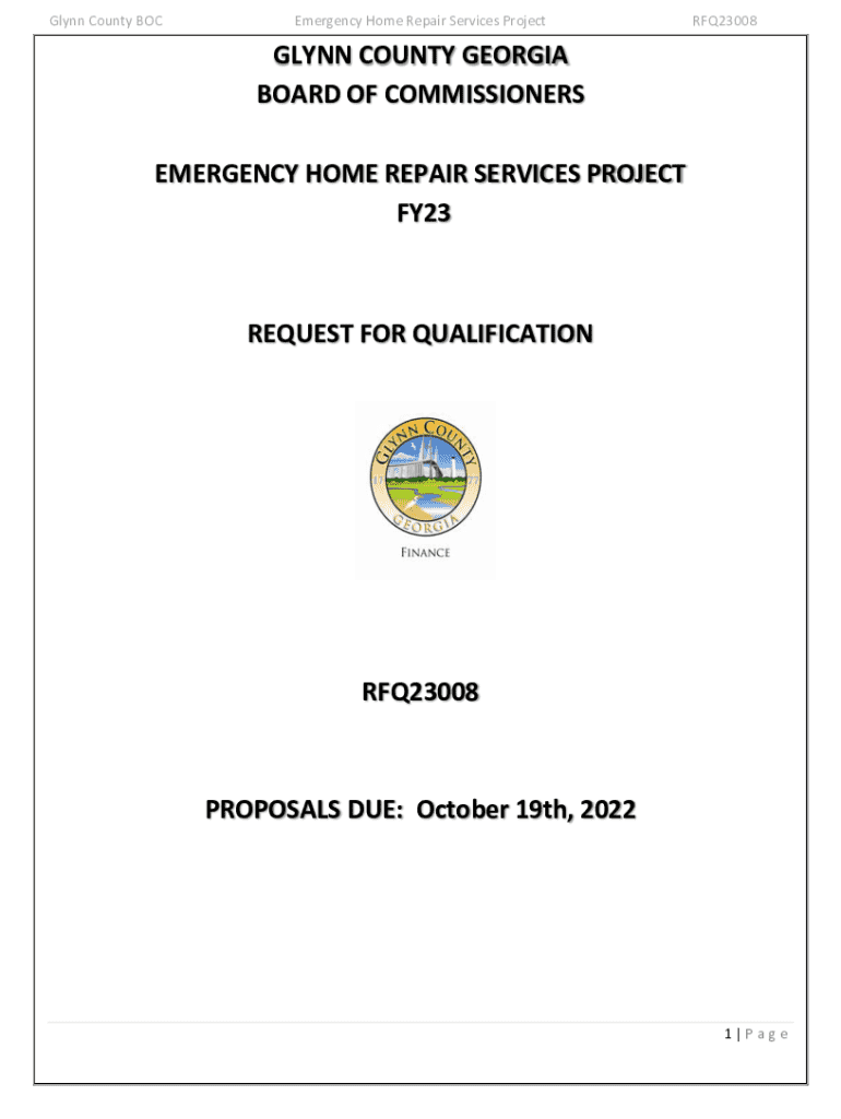 Glynn County BOCEmergency Home Repair Services ProjectRFQ23008GLYNN COUNTY GEORGIA BOARD OF COMMISSIONERS EMERGENCY HOME REPAIR SERVICES PROJECT FY23REQUEST FOR QUALIFICATIONRFQ23008PROPOSALS DUE: