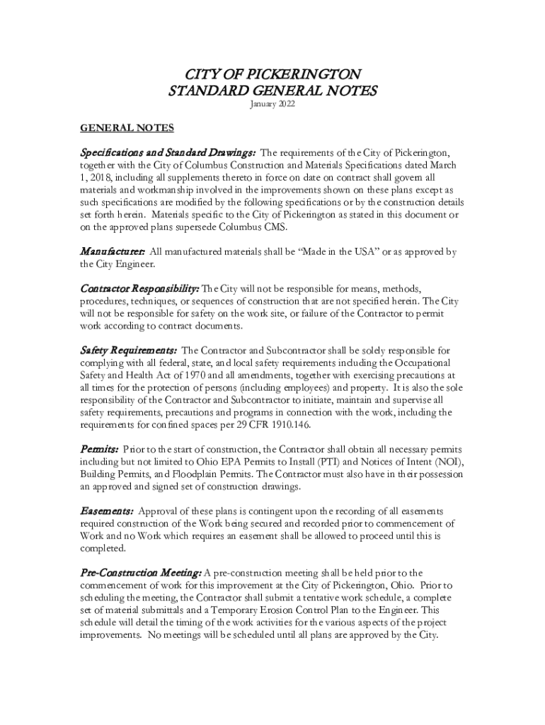 CITY OF PICKERINGTON STANDARD GENERAL NOTES January 2022GENERAL NOTESSpecifications and Standard Drawings: The requirements of the City of Pickerington,together with the City of Columbus Construction