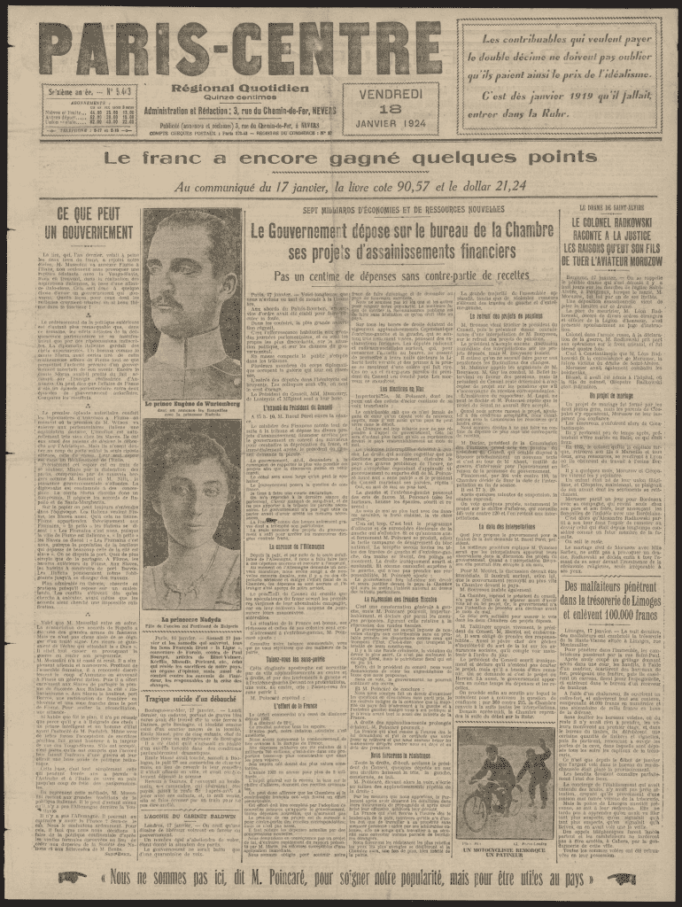 PARISCEE Seizime anRgional Quotidien N 5.4Z3Administration ei Rdaction : 3, rue du ChemindeFer, NE VEItSVENDREDI 18Publicit (annonces et rclames) 3, rue du ChemiudePer, MEVERSJANVIER 1924Quinze centimesABONNEMENTS