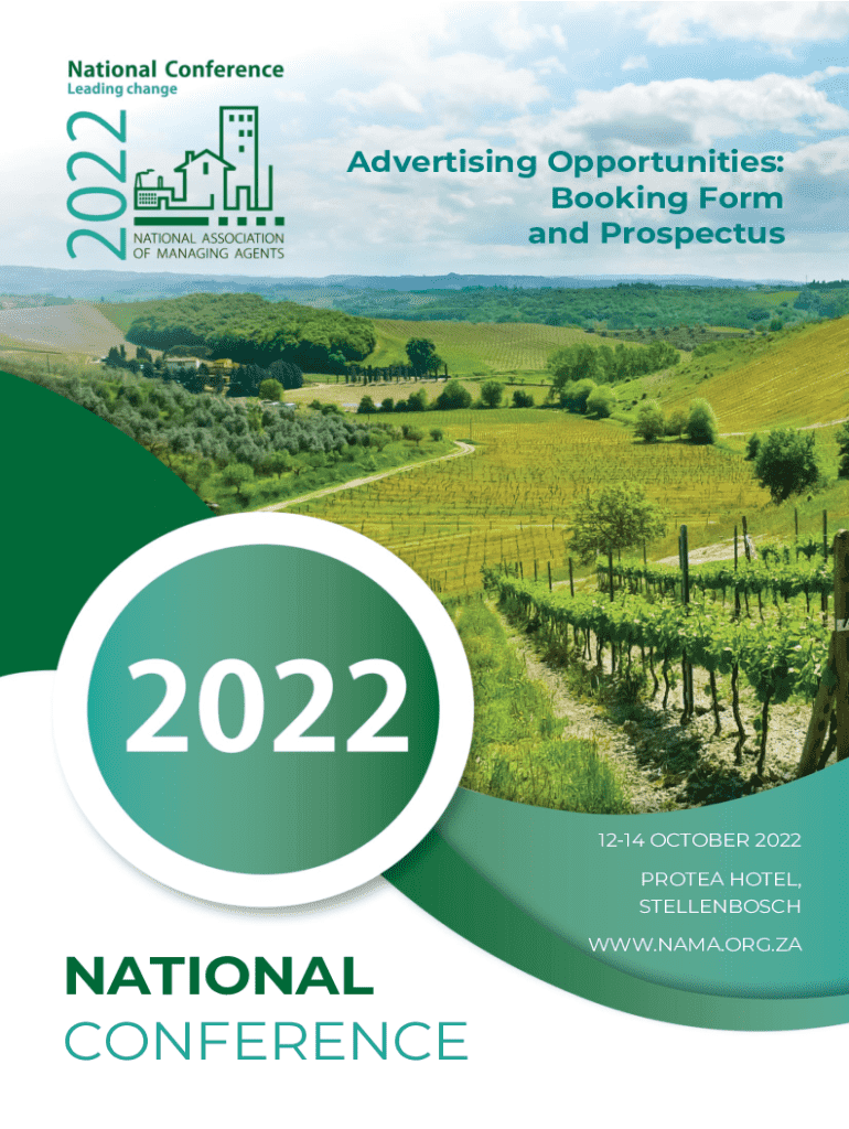 This document serves as the booking form and prospectus for advertising opportunities at the NAMA 2022 National Conference held from 12-14 October 2022 at the Protea Hotel in Stellenbosch. It outlines the various advertising options available, pricing, submission guidelines, cancellation policy, and contact information for the event.