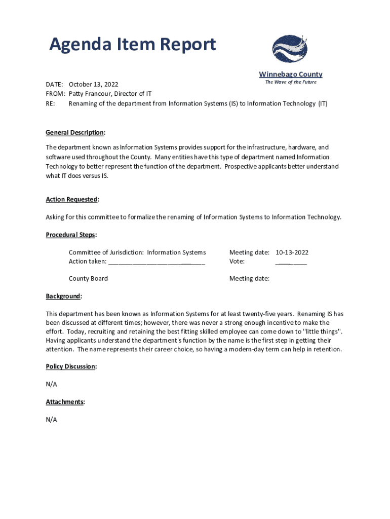 Agenda Item Report Winnebago CountyThe Wave of the Future DATE: October 13, 2022 FROM: Patty Francour, Director of IT RE: Renaming of the department from Information Systems (IS) to Information Technology
