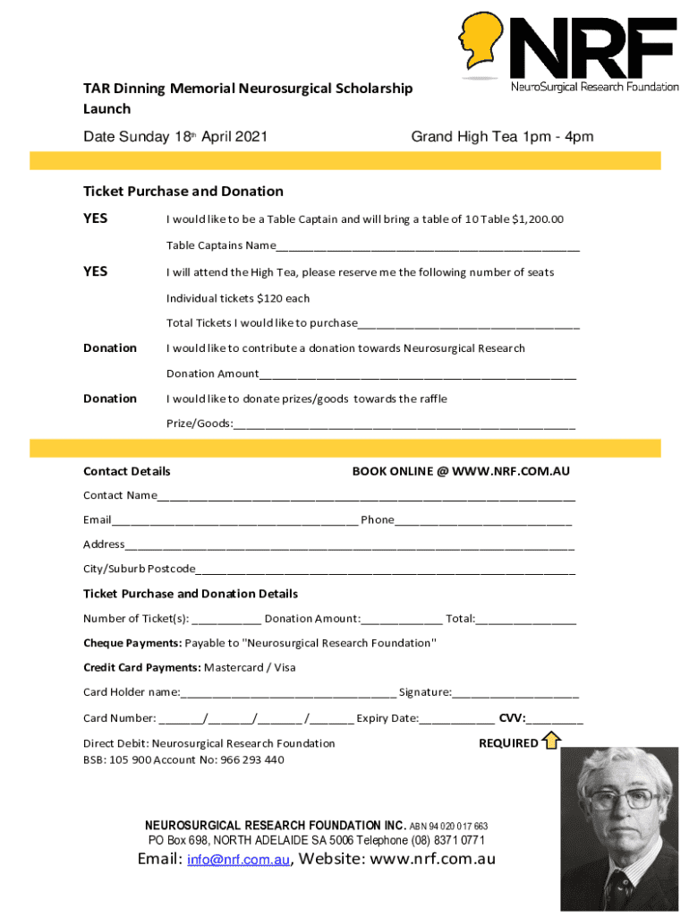 An event to support the TAR Dinning Memorial Neurosurgical Scholarship through a Grand High Tea, allowing attendees to purchase tickets, make donations, and contribute to a raffle.