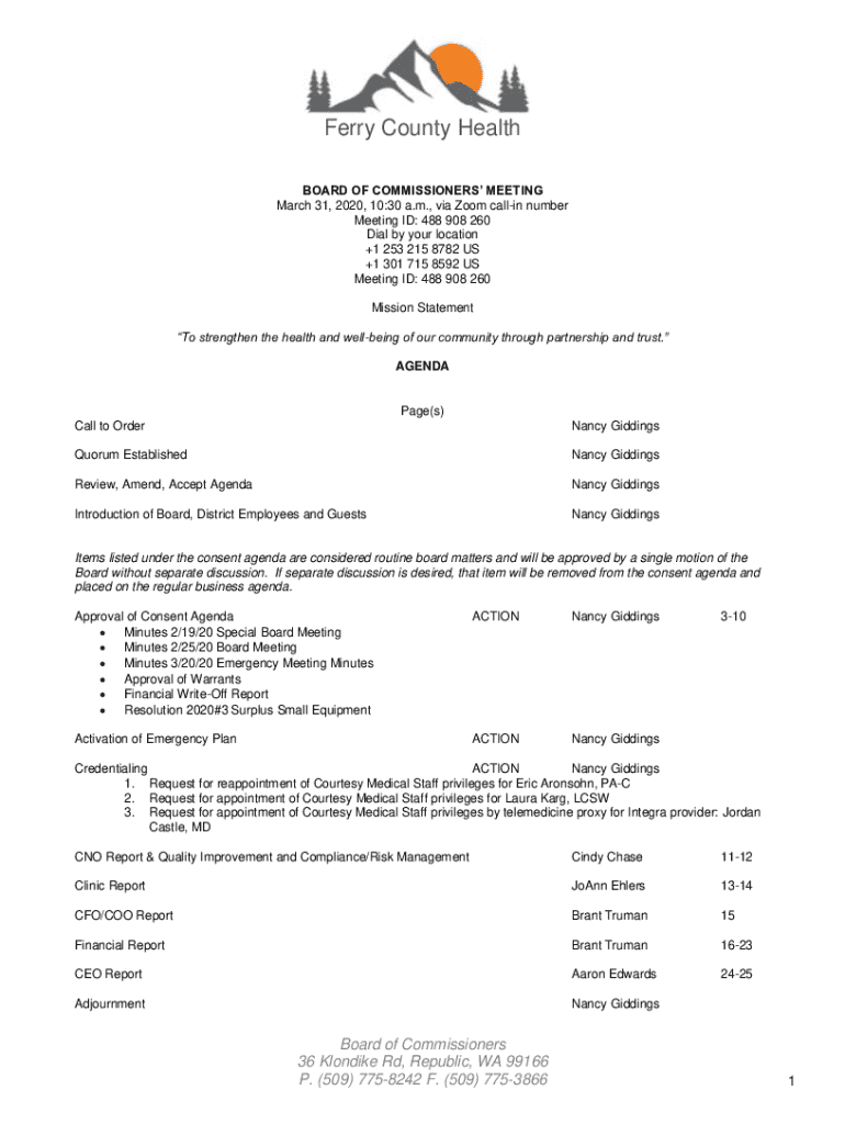 Ferry County Health BOARD OF COMMISSIONERS MEETING March 31, 2020, 10:30 a.m., via Zoom callin number Meeting ID: 488 908 260 Dial by your location +1 253 215 8782 US +1 301 715 8592 US Meeting ID: