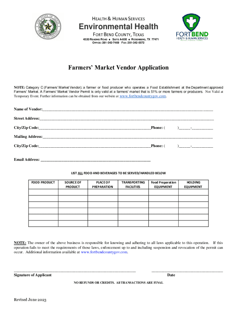 This document serves as an application for vendors wishing to operate at Farmers\' Markets in Fort Bend County, Texas. It includes sections for vendor information, listing food and beverages, and requirements for compliance with health regulations.