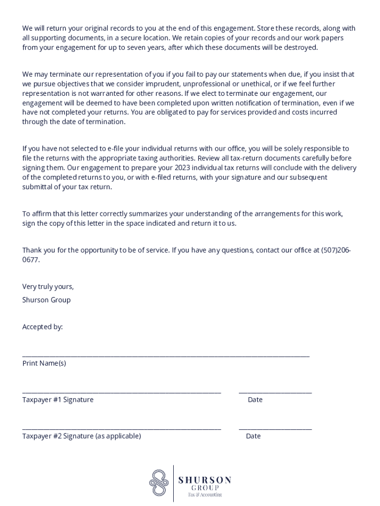 Individual Tax Return Engagement Letter Thank you for choosing Shurson Group to assist you with your 2023 individual taxes. This letter confirms the terms of our engagement with you and outlines the