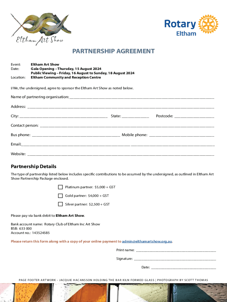 This document outlines the partnership agreement for sponsoring the Eltham Art Show, detailing the types of partnerships available, associated costs, and submission instructions for agreement.