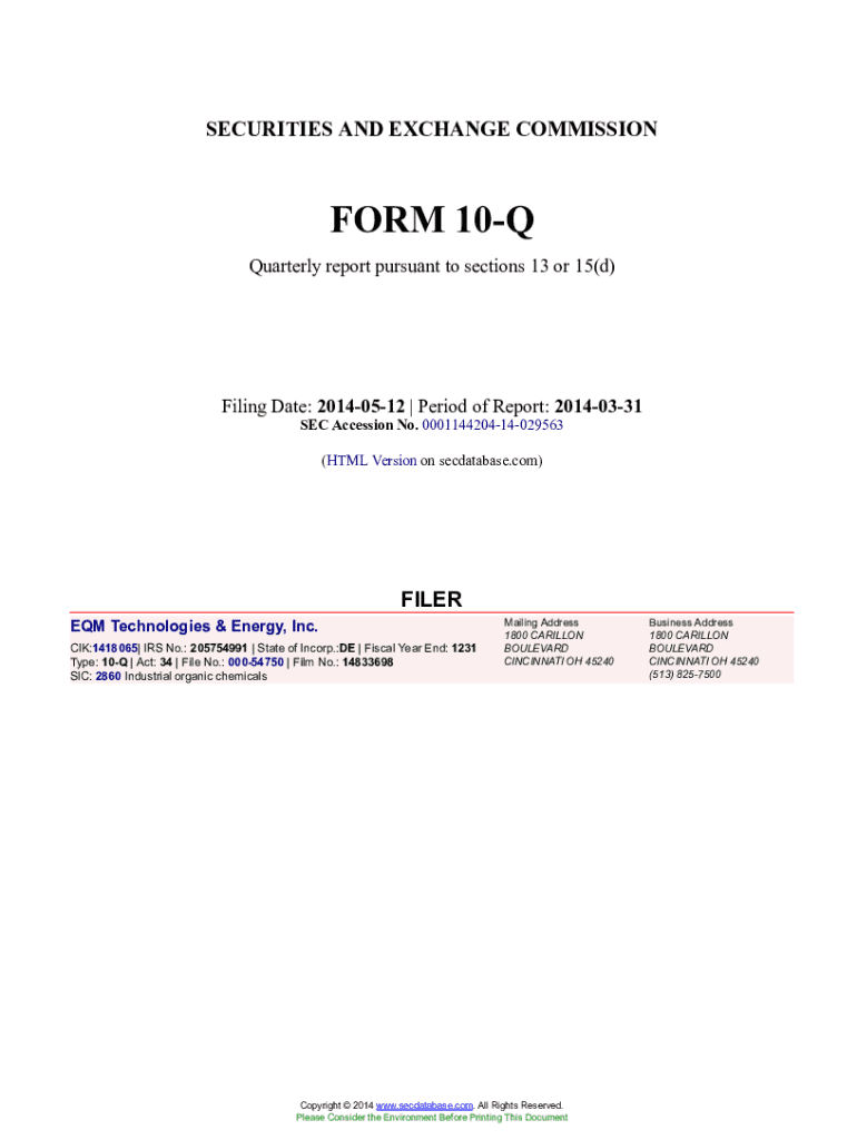 This document is a quarterly report for EQM Technologies & Energy, Inc. for the period ended March 31, 2014, detailing the company\'s financial statements, management\'s discussion and analysis, and other information required by the Securities and Exchange Commission.