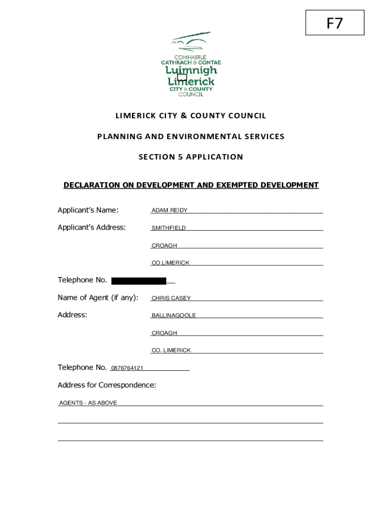 F7LIMERICK CITY & COUNTY COUNCIL PLANNING AND ENVIRONMENTAL SERVICES SECTION 5 APPLICATIONDECLARATION ON DEVELOPMENT AND EXEMPTED DEVELOPMENTApplicants Name:ADAM REIDY ___Applicants Address:SMITHFIELD