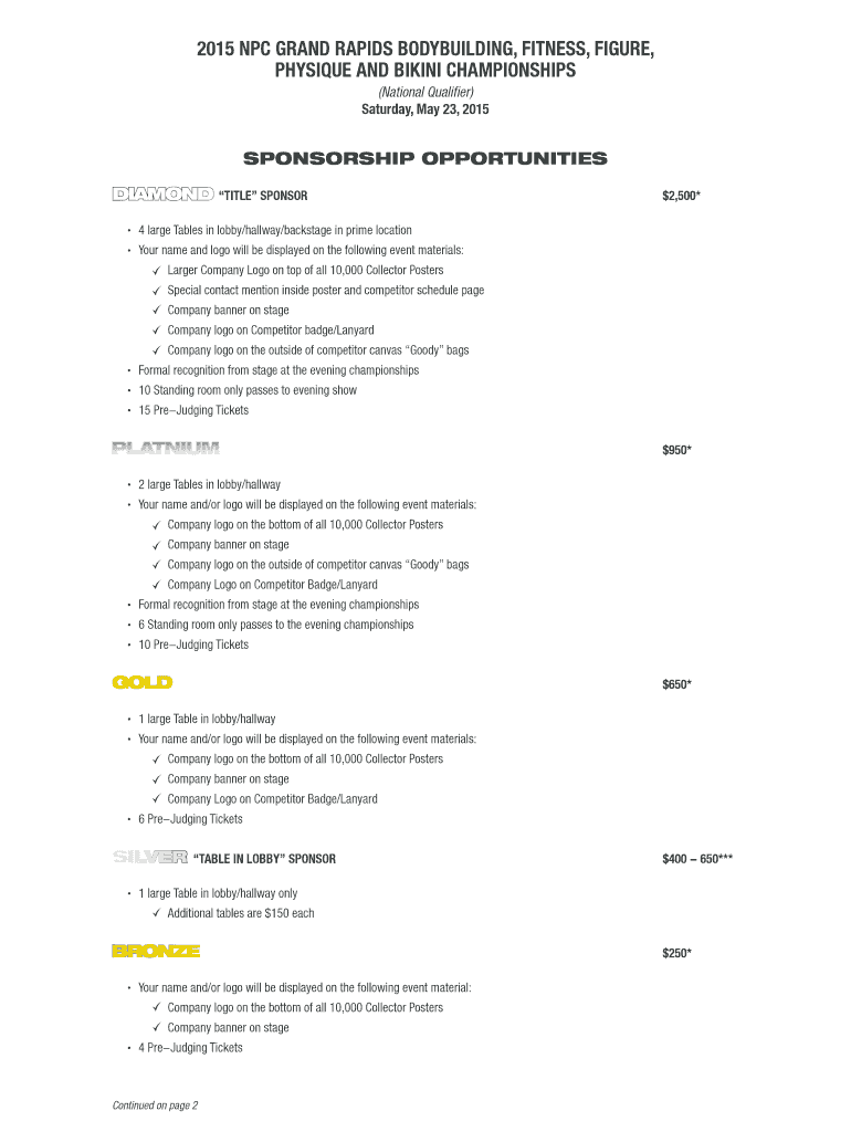 2015 NPC GRAND RAPIDS BODYBUILDING, FITNESS, FIGURE, PHYSIQUE AND BIKINI CHAMPIONSHIPS (National Qualifier) Saturday, May 23, 2015, SPONSORSHIP OPPORTUNITIES DIAMOND TITLE SPONSOR $2,500 4 large Tables