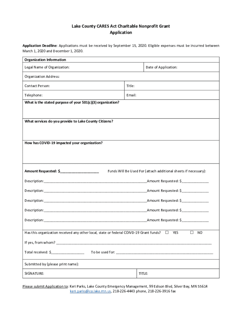 Lake County CARES Act Charitable Nonprofit Grant Application Application Deadline: Applications must be received by September 15, 2020. Eligible expenses must be incurred between March 1, 2020 and