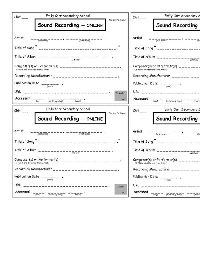 This document is a form used by students at Emily Carr Secondary School to submit information related to their sound recordings. It includes fields for the student\'s name, title of the song, title of the album, composers or performers, recording manufacturer, publication date, and URL for accessing the sound recording online.