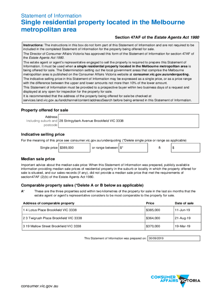 This document provides essential information regarding the sale of a single residential property located in the Melbourne metropolitan area, in accordance with Section 47AF of the Estate Agents Act 1980. It details the indicative selling price, comparable property sales, and instructions for estate agents or their representatives in preparing and providing this statement to prospective buyers.