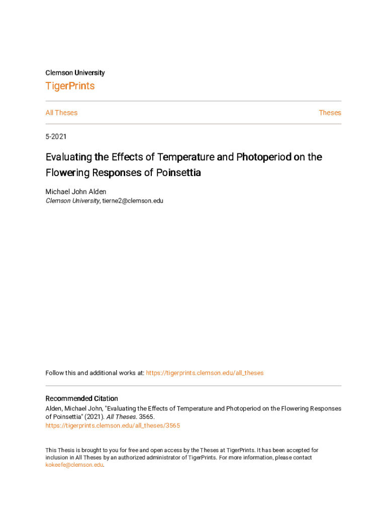 Clemson UniversityTigerPrints All ThesesTheses52021Evaluating the Effects of Temperature and Photoperiod on the Flowering Responses of Poinsettia Michael John Alden Clemson University, tierne2@clemson.eduFollow