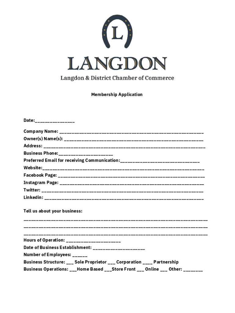 Membership ApplicationDate:___ Company Name: ___ Owner(s) Name(s): ___ Address: ___ Business Phone:___ Preferred Email for receiving Communication:___ Website:___ Facebook Page: ___ Instagram Page: