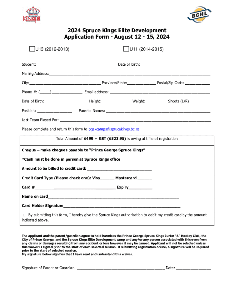 2024 Spruce Kings Elite Development Application Form August 12 15, 2024 U13 (20122013)U11 (20142015)Student: ___ Date of birth: ___ Mailing Address:___ City:___ Province/State:___ Postal/Zip Code: