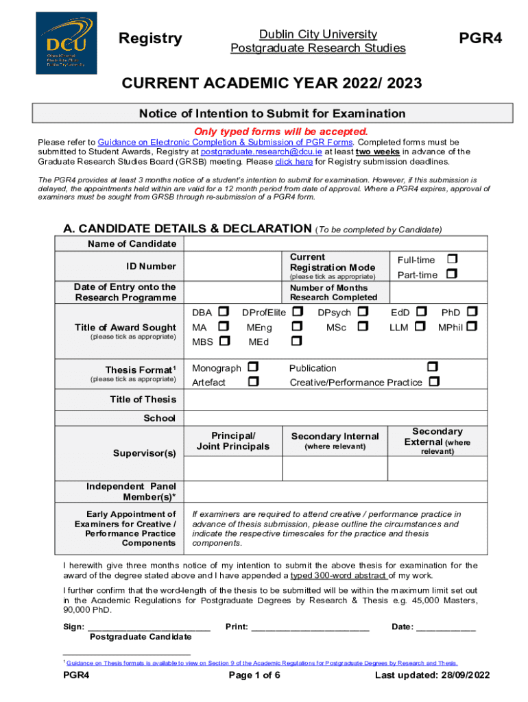 Dublin City University Postgraduate Research StudiesRegistryPGR4CURRENT ACADEMIC YEAR 2022/ 2023 Notice of Intention to Submit for Examination Only typed forms will be accepted.Please refer to Guidance