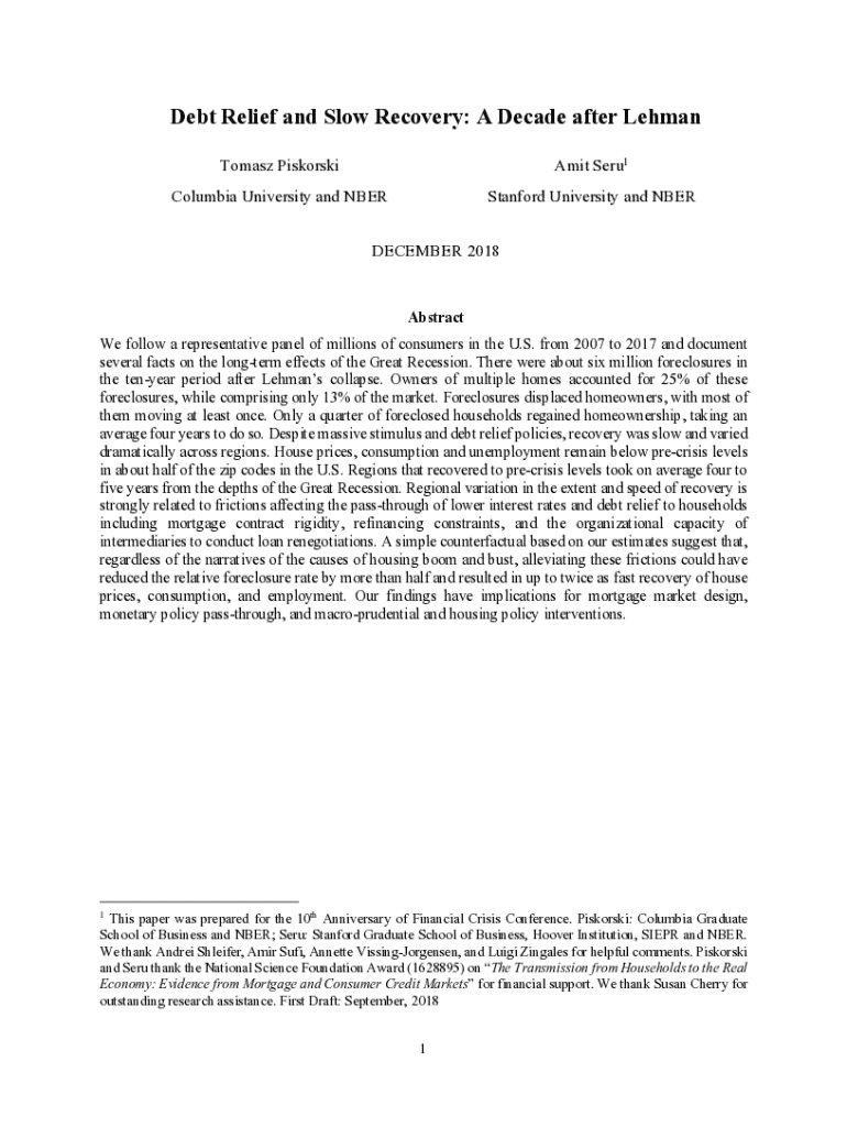 This document analyzes the long-term effects of the Great Recession by tracking millions of U.S. consumers from 2007 to 2017. It highlights the significant number of foreclosures, the slow recovery of various economic metrics, and regional variations in recovery outcomes. The findings point to the importance of overcoming financial intermediation frictions in order to facilitate better mortgage market designs and effective monetary policy.