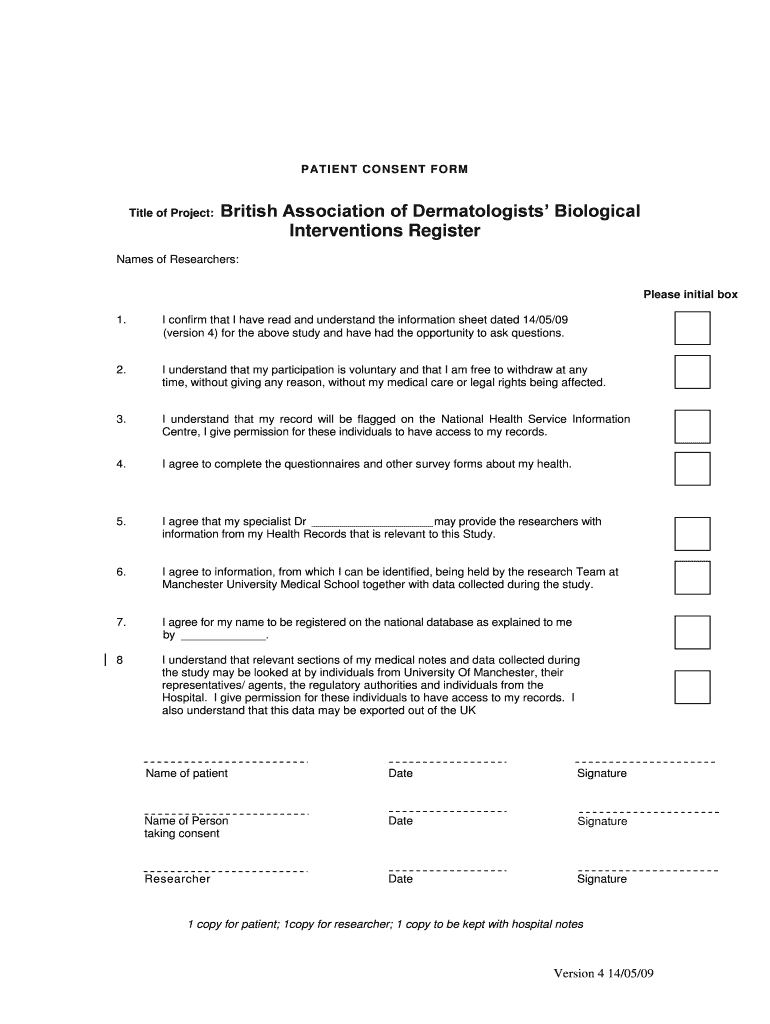 PATIENT CONSENT FORM Title of Project: British Association of Dermatologists Biological Interventions Register Names of Researchers: Please initial box 1. I confirm that I have read and understand