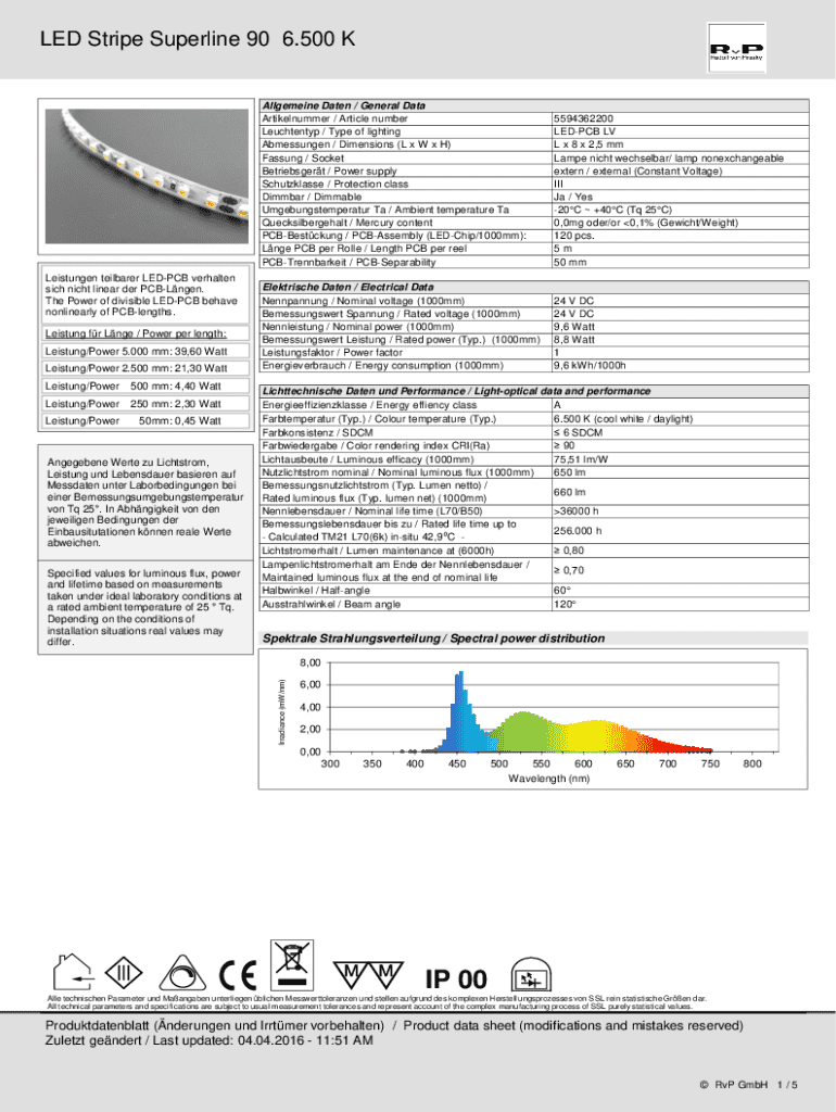 LED Stripe Superline 90 6.500 KLeistungen teilbarer LEDPCB verhalten sich nicht linear der PCBLngen. The Power of divisible LEDPCB behave nonlinearly of PCBlengths. Leistung fr Lnge / Power per length: