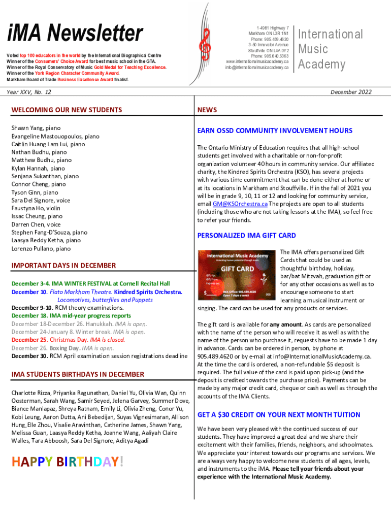 iMA Newsletter14981 Highway 7 Markham ON L3R 1N1 Phone: 905.489.4620 350 Innovator Avenue Stouffville ON L4A 0Y2 Phone: 905.640.6363 www.internationalmusicacademy.ca info@internationalmusicacademy.caVoted
