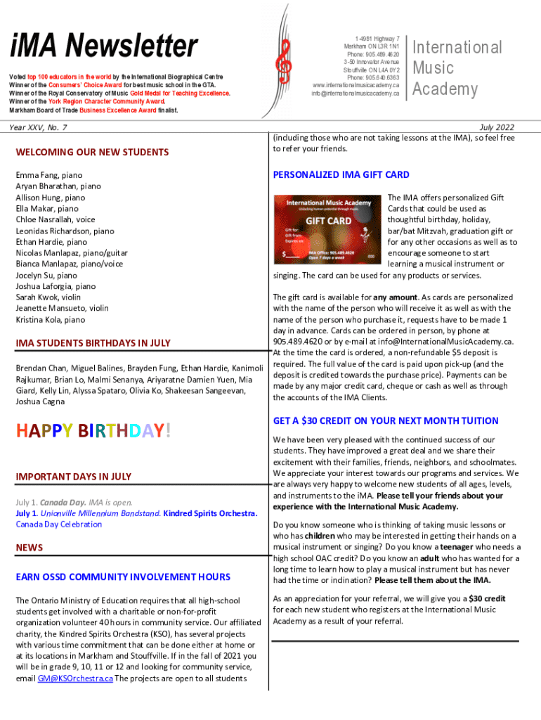 This newsletter from the International Music Academy highlights recent achievements, welcomes new students, shares important dates, offers promotional information on gift cards and community involvement opportunities, and features articles about music exploration habits and a prominent teacher and student of the month.