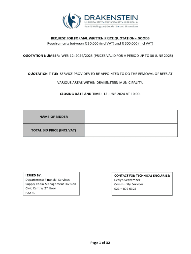 REQUEST FOR FORMAL WRITTEN PRICE QUOTATION GOODS Requirements between R 30,000 (incl VAT) and R 300,000 (incl VAT) QUOTATION NUMBER: WEB 12: 2024/2025 (PRICES VALID FOR A PERIOD UP TO 30 JUNE 2025)QUOTATION
