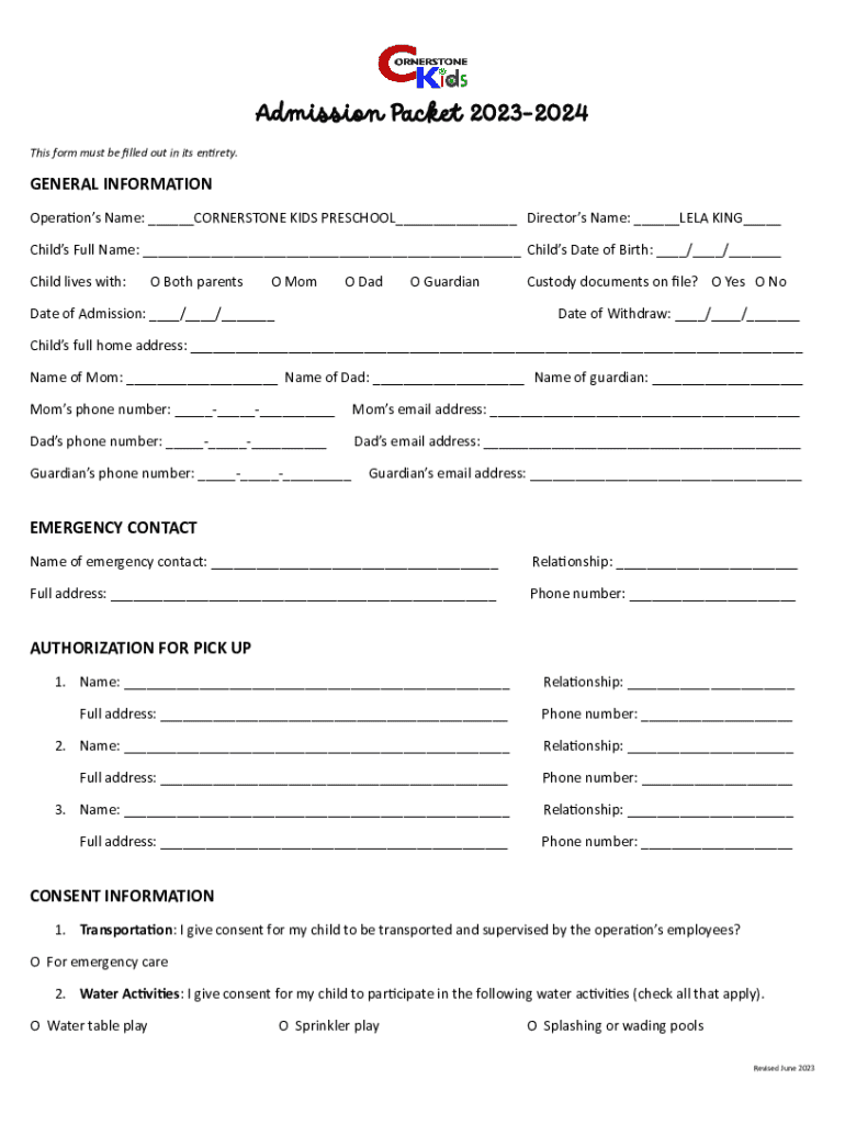 This document serves as the admission packet for Cornerstone Kids Preschool for the 2023-2024 school year. It collects essential information about the child, including general details, emergency contacts, consent forms, and immunization records. Parents or guardians are required to fill out this form to ensure proper enrollment and care of their child in the preschool program.